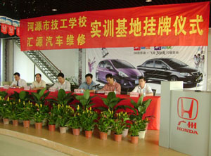 10月26日上午,河源市技工學(xué)校匯源汽車銷售公司實訓(xùn)基地掛牌儀式在匯源汽車銷售公司舉行。河源市技工學(xué)校100多名師生、匯源汽車銷售公司部分員工參加了掛牌儀式。市委常委、市政府副市長楊耀初同志,市政府邱榮輝副秘書長,及市勞動保障局等部門領(lǐng)導(dǎo)出席了掛牌儀式。掛牌儀式由市勞動保障局歐繼勝副局長主持,匯源集團(tuán)賴運宏董事長在掛牌儀式上致詞,市技工學(xué)校歐陽仕文校長發(fā)表講話。最后,楊耀初副市長作了重要講話。楊副市長充分肯定了匯源汽車銷售公司與市技工學(xué)校的合作,高度贊揚了匯源汽車銷售公司勇?lián)鐣?zé)任、充滿愛心的企業(yè)精神;希望校企繼續(xù)努力,更快、更好地為社會培養(yǎng)更多、更優(yōu)的有用人才!
